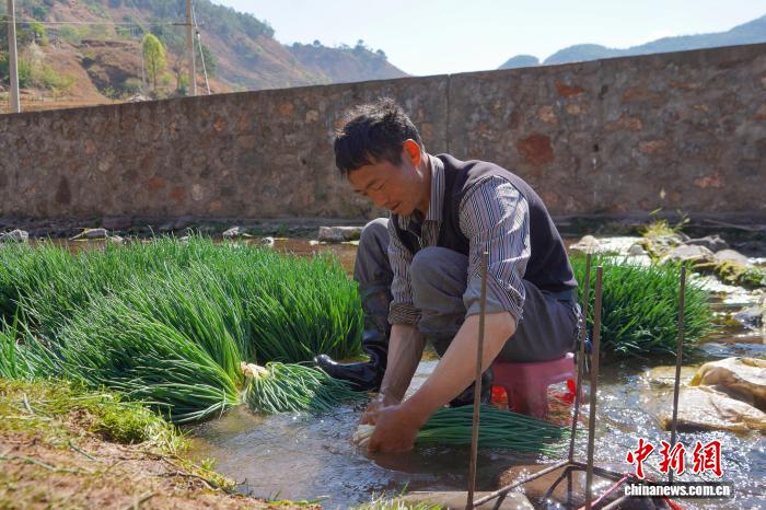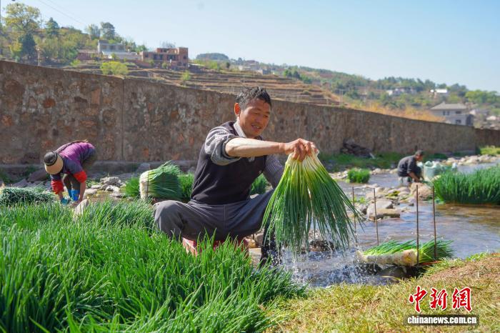 图为3月24日,威宁自制县哲觉镇瓦竹村小葱培植基天,栽植户正在小河中冲洗刚刚采支的小葱。赵庆能 摄