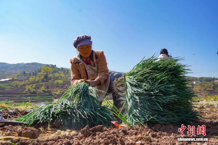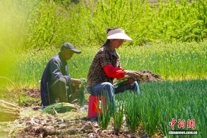 图为3月24日,威宁自制县哲觉镇中收村蔬菜基天,莳植户采支小葱。赵庆能 摄