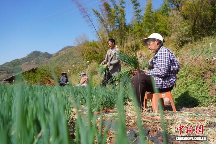 图为3月24日,威宁自制县哲觉镇瓦竹村小葱培植基天,务工民众采支小葱。赵庆能 摄
