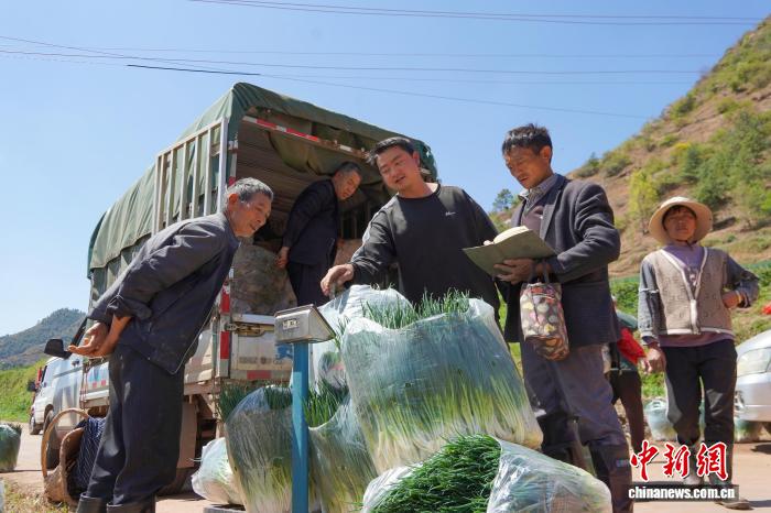 图为3月24日,威宁自制县哲觉镇瓦竹村小葱培植基天,收买商对于刚刚采支的小葱称沉。赵庆能 摄
